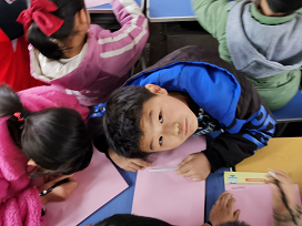 在正式活动开始前,实践队成员通过“萝卜蹲”“一块五角”等破冰小游戏与小朋友们迅速打成一片。之后,同学们分小组深入班级开展各项小组活动。“我想对你说——和家里人说说心里话”用给家里人的一封信或一幅画的形式,引导小朋友们分享自己和父母家人之间的相处方式、日常趣事等,帮助孩子们感受家庭互动沟通;“我们都是好孩子——良好学习习惯分享计划”则通过“击鼓传花”的游戏形式分享学习好习惯;“理想大学大家谈——畅想未来大学生活”通过实践小组成员对自己大学学习、生活、实践等方面的分享以及对小朋友们问题的一一解答,激发小朋友们对未来美好生活以及学习目标的希望和期许。活动在热烈的气氛中持续两个多小时,同学们的鼓励引导和小朋友们的积极参与使活动取得了良好的效果。