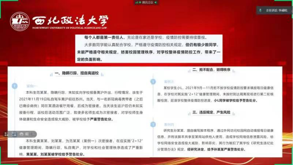 学院本科生党支部书记慕婧和辅导员李彧昭以“同舟共济,共渡难关”为主题,分别为本支部党员及全体团员进行了思政第一课讲授。通过对中国伟大抗疫精神事例的展示以及学校目前防疫政策的解读,向学生们说明了当前严峻的疫情形势以及学校应对疫情所做各项工作的必要性,对在校生提出了以下几点希望和要求:一是一定要高度重视,积极配合学校的疫情防控工作,认真填写所需汇总的各项信息;二是在宿舍要注意个人卫生,做好个人防护,尤其是志愿者要加强防护;三是珍惜时间,特殊时期更应该认真学习,做好个人规划。